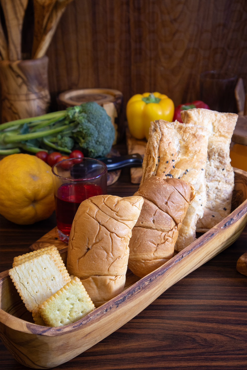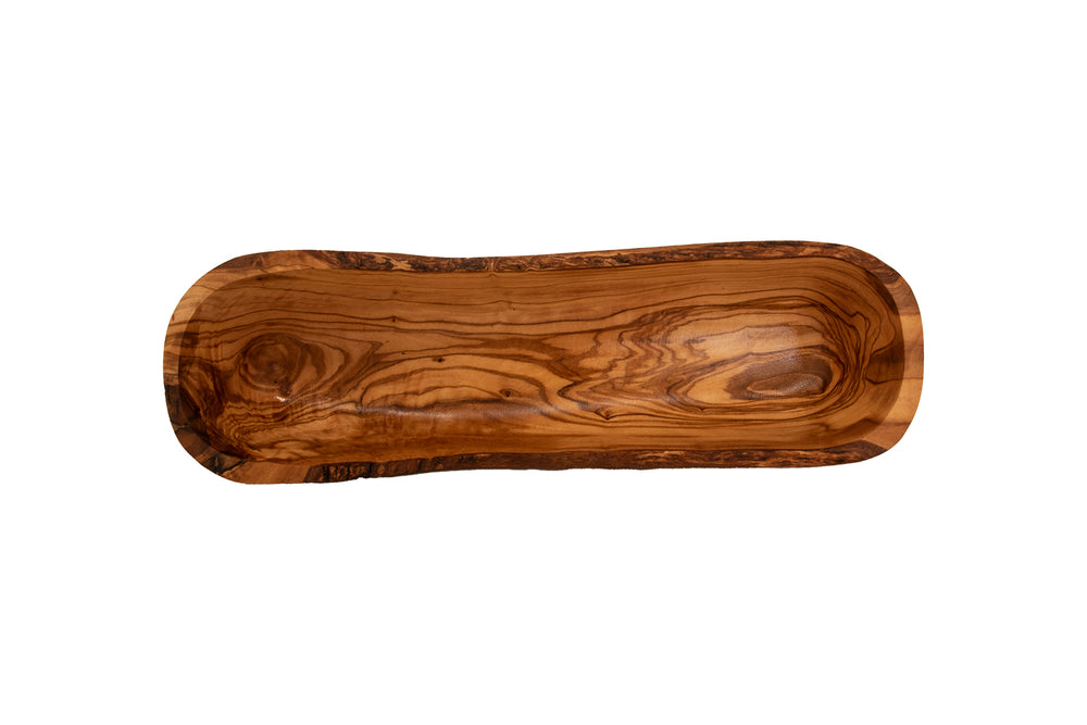 • Handcrafted 14" olive wood baguette bowl with naturally preserved bark edges