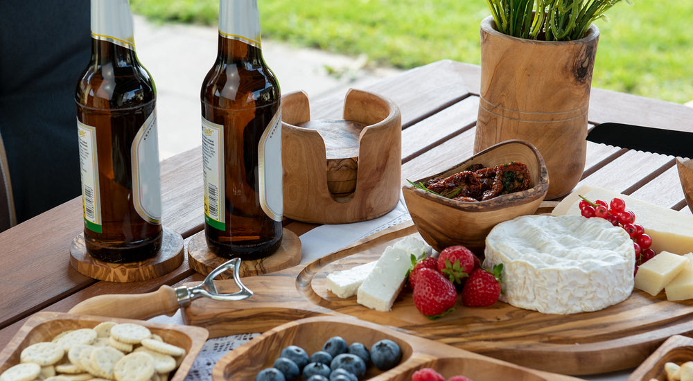 The set includes a solid olive wood holder that keeps your coasters neatly stacked and always ready to use. With its smooth finish and rounded edges, it becomes a decorative highlight on any countertop, coffee table, or patio bar.