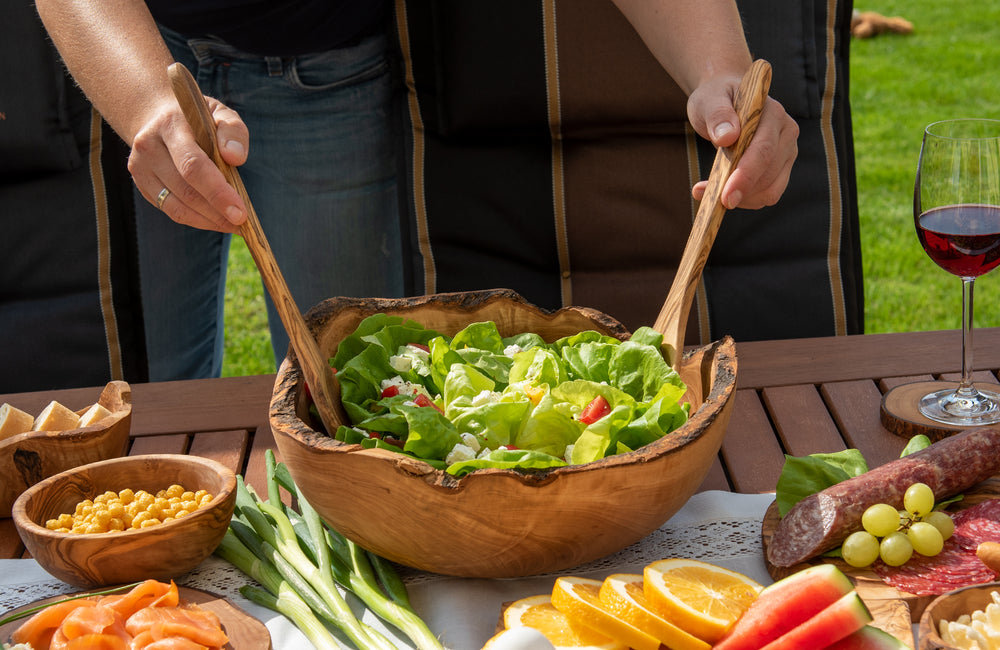 Olive wood is naturally dense yet soft on your finest salad bowls. The spoon and fork work together to cradle leafy salads or pasta dishes without bruising or spilling. The fork’s wide prongs help lift and serve with precision.