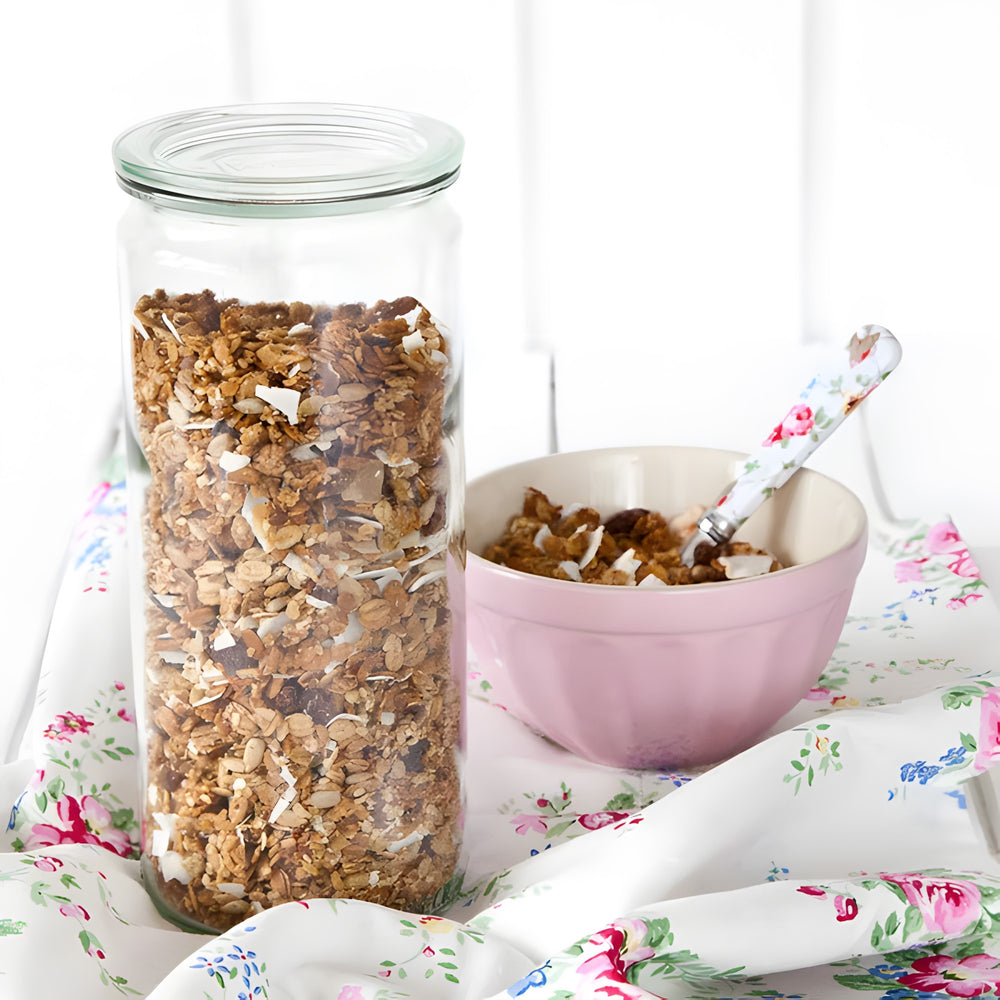 This tall cylindrical jar from WECK holds up to 35 oz (approx. 1 liter) and is perfect for bulk goods like grains, pasta, or dried fruit. Its slim profile fits beautifully on shelves or inside cabinets, while the crystal-clear glass keeps your ingredients visible and your pantry looking organized.
